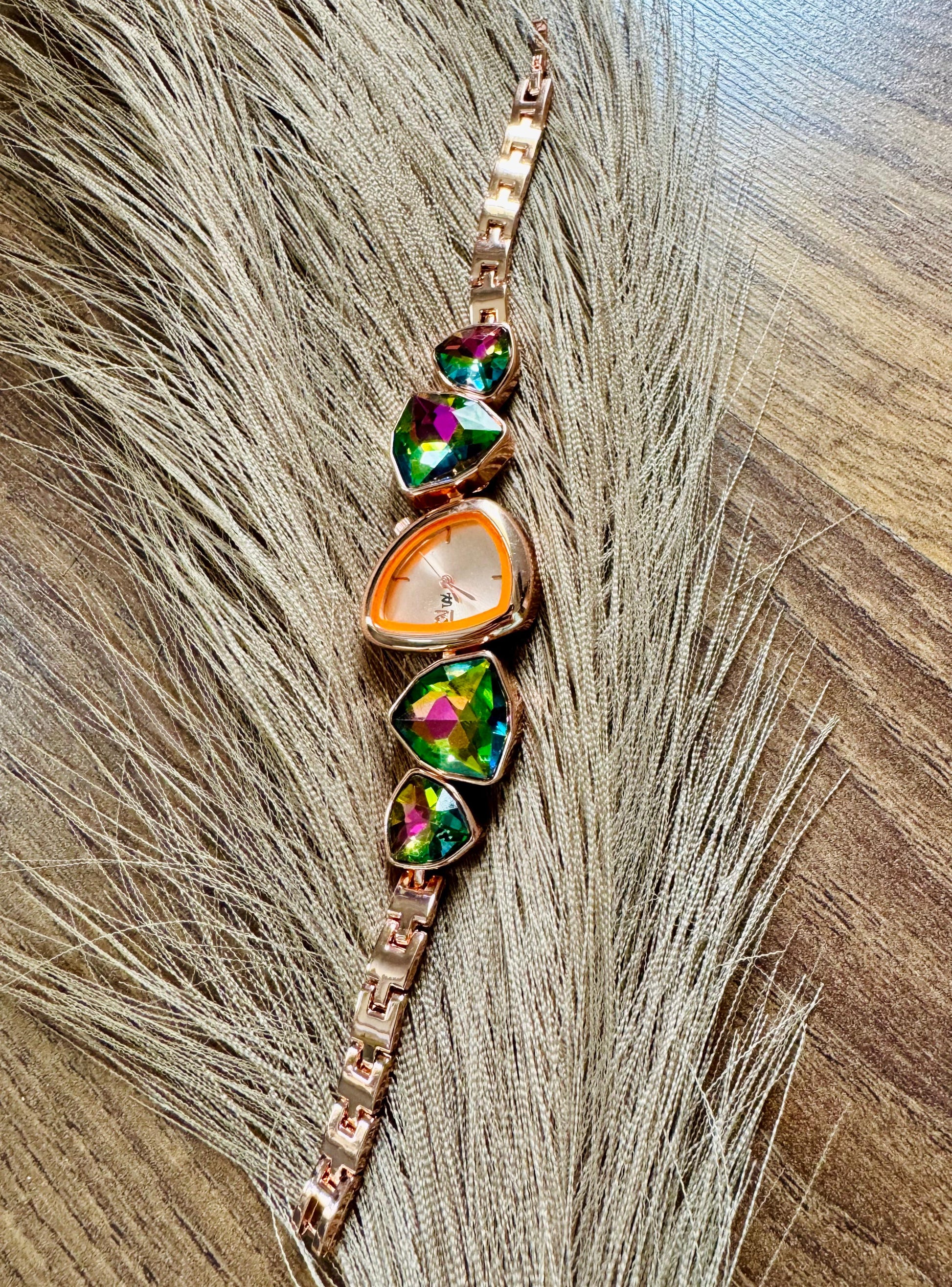 Strap Style :- rose gold toned, embellished, metal strap with a foldover